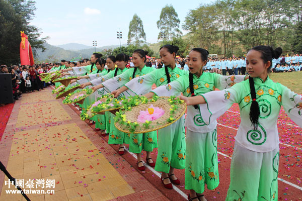 古竹頂新中學學生在剪彩儀式后表演客家舞蹈“請到客家土樓來做客”(中國臺灣網 蕪同 攝)