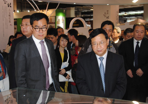 11月7日上午,國(guó)臺(tái)辦交流局長(zhǎng)程金中(前右)在臺(tái)北市文化局長(zhǎng)劉維公(前左)陪下參觀第八屆文博會(huì)臺(tái)灣文創(chuàng)精品館。(北京市通訊員 郭寧 攝)