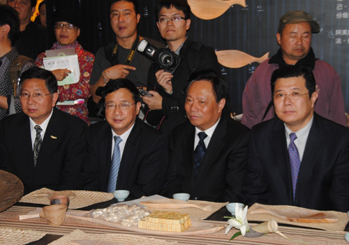 11月7日上午,第八屆文博會(huì)臺(tái)灣文創(chuàng)精品館舉辦臺(tái)灣少數(shù)民族“部落行銷”開幕式。全國(guó)臺(tái)聯(lián)黨組書記梁國(guó)揚(yáng)(右二)、國(guó)臺(tái)辦交流局長(zhǎng)程金中(左二)、北京市臺(tái)辦主任汪明浩(右一)和臺(tái)旅會(huì)辦事處主任楊瑞宗(左一)出席。(北京市通訊員 郭寧 攝)