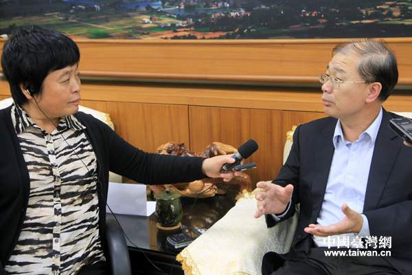 記者何端端采訪金門縣長李沃士。(李建偉 攝)