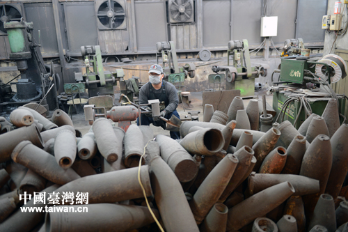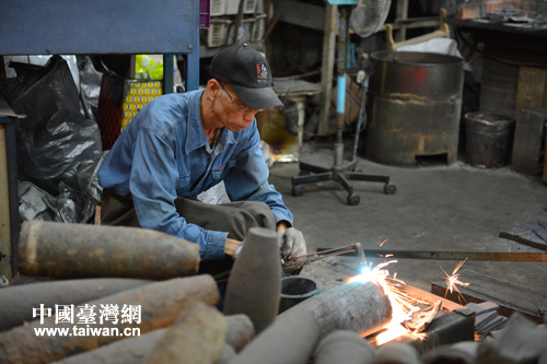 吳增棟師傅在切割炮彈殼。(李建偉 攝)