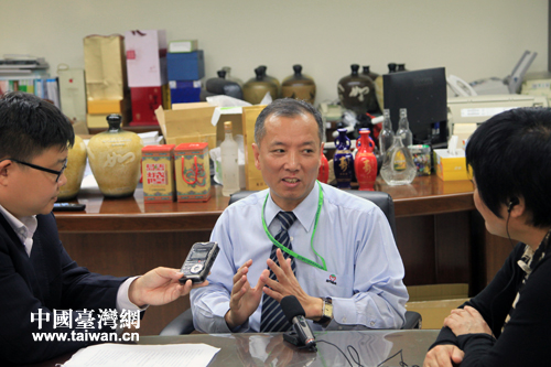 記者采訪金門高粱酒廠總經理吳秋穆。(李建偉 攝)