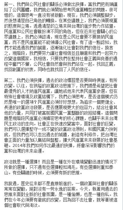 她還說,2013年的多次公民團體走上街頭,民進黨與公民社會的關系必須做出抉擇,“當我們把街頭讓給了公民團體,我們就必須開始思考民進黨轉型的問題”。