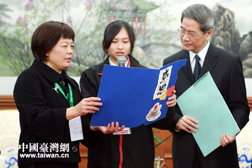 中國(guó)臺(tái)灣網(wǎng)1月10日北京消息 中共中央臺(tái)辦、國(guó)務(wù)院臺(tái)辦主任張志軍10日在北京會(huì)見了東莞臺(tái)商子弟學(xué)校葉宏燈董事長(zhǎng)率領(lǐng)的畢業(yè)班學(xué)生“北京文化之旅”參訪團(tuán)一行。