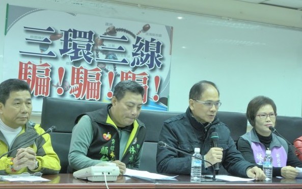 民進(jìn)黨新北市長(zhǎng)候選人游錫堃和議會(huì)黨團(tuán)追打三環(huán)三線,批朱立倫騙騙騙最后什么都看不見。(臺(tái)媒圖)