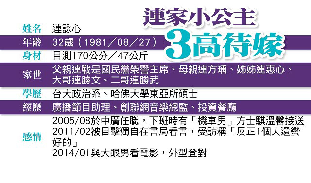 中國臺灣網(wǎng)1月19日消息 據(jù)臺灣媒體報道,國民黨榮譽(yù)主席連戰(zhàn)育有2子2女,至今只剩32歲的小女兒連詠心還未結(jié)婚。前晚,有記者目擊她和1名高大男子在影城買快餐、喝飲料,身旁的“他”是不是男友?連詠心否認(rèn),表示2人是“大學(xué)同學(xué)”。
