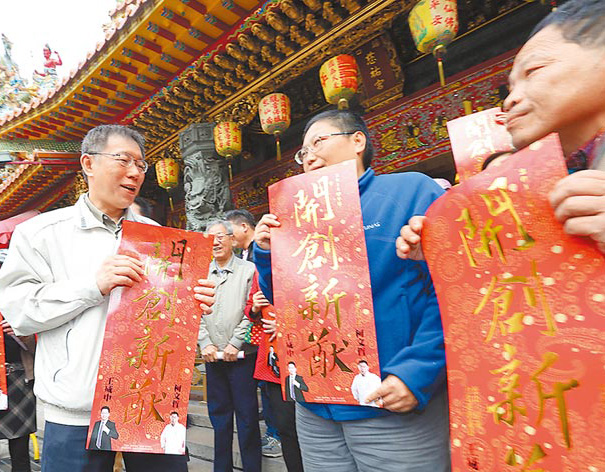 柯文哲18日至臺北松山慈佑宮發送春聯,把投入選戰喻為創投。(來自臺灣《中國時報》)