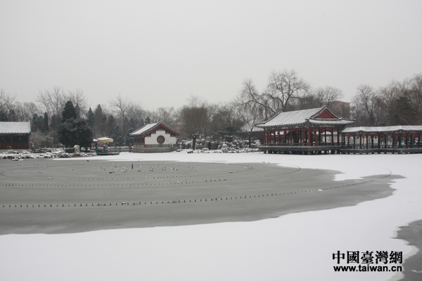 遠(yuǎn)攝雪中的北京大觀園湖泊。(中國臺(tái)灣網(wǎng) 王文英攝)