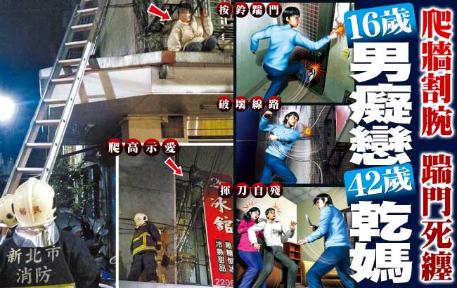 臺灣16歲男癡戀42歲干媽,爬墻割腕踹門死纏。(臺媒圖)