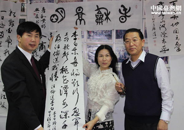 中國臺灣網2月15日高雄消息 2月14日上午,應臺灣中華海峽兩岸企業交流協會的邀請,參加第三屆高雄燈會藝術節暨北京特色周活動的書畫家程茂全、王興家、張和平、慕云五,與來自臺灣的康景文、楊濤、陳麗卿、洪塔美等書畫家在高雄舉辦了“兩岸書畫家交流筆會”。兩岸書畫家揮毫潑墨,以筆會友,以畫傳情。(中國臺灣網記者 李婷婷)