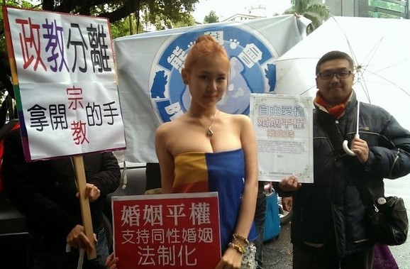 中國臺灣網(wǎng)2月19日消息 據(jù)臺灣“東森新聞”報道,素有“I級艷后”與“匈奴女神”之稱的藝人馬友蓉,19日上午冒著寒風細雨,以上半身裹著彩虹旗的裝扮,赴“立法院”向國民黨“立委”賴士葆嗆聲,批評他不應將宗教的手伸進行政機關,她擔心,如此一來,支持同志婚姻平權的聲音無法生存,“性平會”將淪為“一言堂”。
