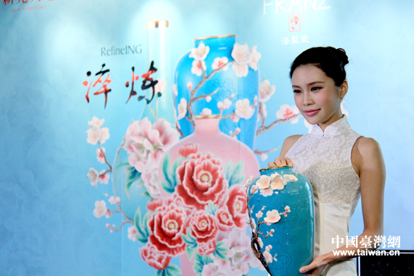 法藍瓷24日在京推出“紅樓夢”系列瓷品,圖為詮釋探春所抽杏花“名簽”的瓷瓶——春曉(中國臺灣網 李徽 攝)