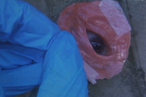 消防人員小心翼翼的爬上遮雨棚,這回不是要救受困的貓狗,而是要撿一顆掉在上面、一個像肉的“塊狀物”。消防隊員翻過來一看,竟然是一顆“眼睛”,而且做得相當逼真,橡膠材質摸起來跟皮膚一樣有彈性,還用透氣膠布黏起來。
