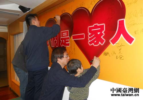 七歲的小卓在父親的帶領(lǐng)下于“我們是一家人”的簽名版上寫下自己的名字。(中國(guó)臺(tái)灣網(wǎng) 林天泉 攝)