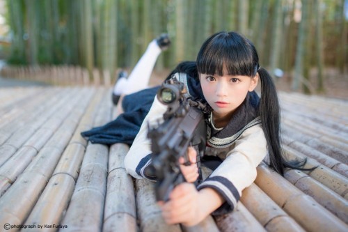 日本學生妹持槍萌照臺灣爆紅,海量美圖超越界。(臺媒圖)
