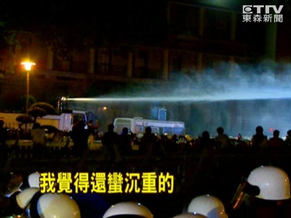 2008臺北市警局曾出動水車驅離群眾,平常備而不用的水車,6年后再次派上用場,卻是張姓警察最不樂見的。一方面遭受攻擊,一方面必須要執行勤務,面對失控的場面,他坦承當下心情很復雜,從警22年,曾經在2000年“大選”后的抗議行動中執行過任務,沒想到13年后值勤,會再次坐上水車駕駛座。他表示,“大家都沒有拍到的,攻擊警察,甚至到最后有人拿鐳射槍,一直在照我的眼睛,我覺得還蠻沉重的。”