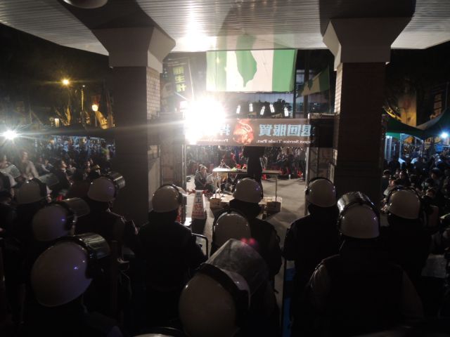 反服貿學生雖已退出議場,但部分“獨派”團體人士仍占領“立法院”大門前廣場不肯離去,警方也嚴陣以待。(圖片來自臺媒)