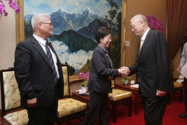 臺灣地區(qū)副領(lǐng)導(dǎo)人吳敦義(右)接見第五屆“監(jiān)察院院長”被提名人張博雅(中)、“副院長被提名人”孫大川(左)。(圖片來源:臺灣“中央社”)