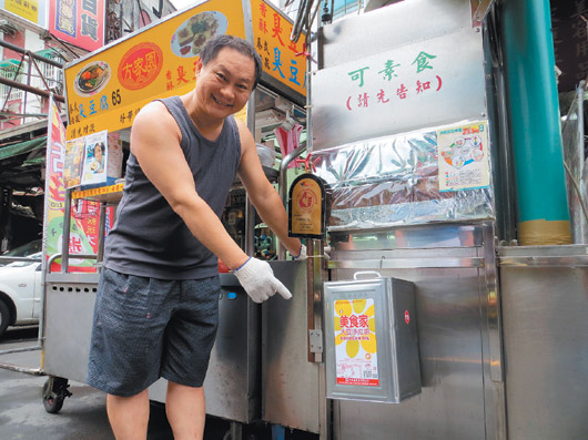 基隆廟口夜市營養三明治攤位貼出衛生局稽查合格綠色標章,隔壁賣素食的也貼公告,業者說雖沒用豬油,為讓消費者放心,“多貼一張沒關系”。