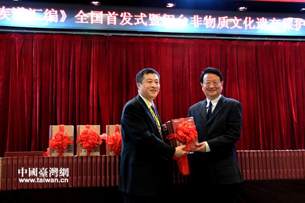 《臺海文獻匯刊》、《閩南涉臺族譜匯編》29日在京首發,圖為臺灣成功大學人文社科中心副主任陳益源接受閩南師范大學贈書(中國臺灣網 李徽 攝)