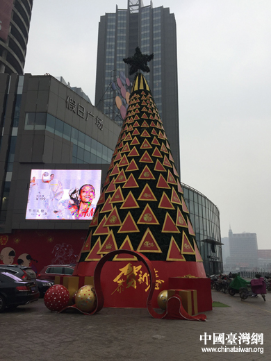 2月15日,濰坊小雨,商場前高大的春節擺設,讓車來車往的大街上多了一抹紅色的喜慶。(中國臺灣網 張玲 攝)