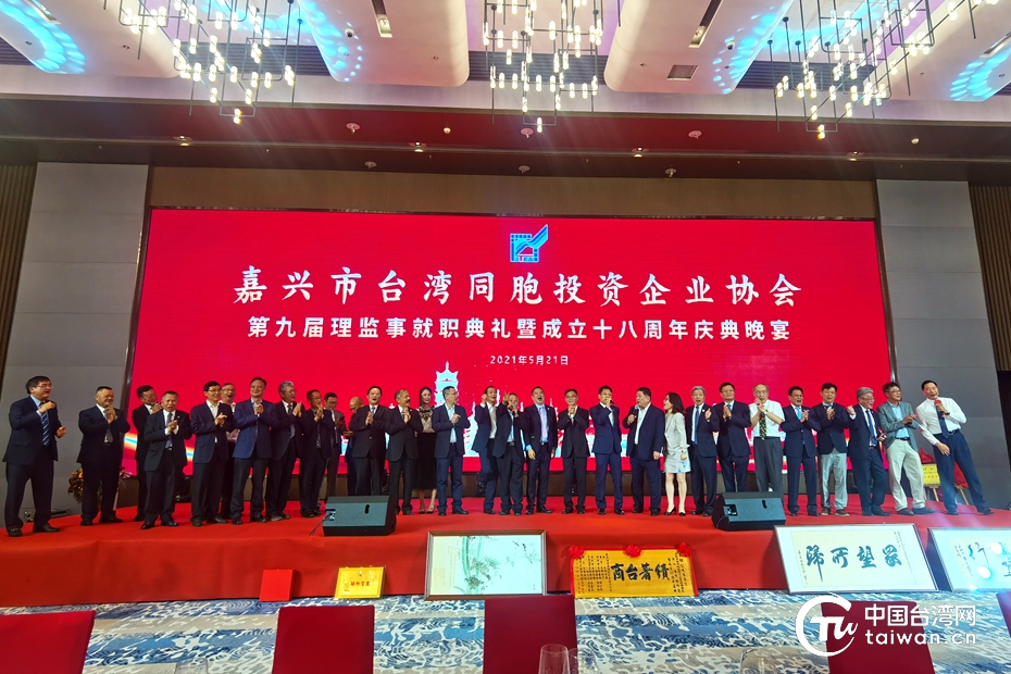 中國臺灣網5月21日嘉興訊 今天,浙江省嘉興市臺灣同胞投資企業協會第九屆理監事就職典禮暨成立十八周年慶典晚宴在嘉興市舉行。圖為與會在陸臺商嘉賓齊唱“愛拼才會贏”,共為中華謀復興。ㄍ辏