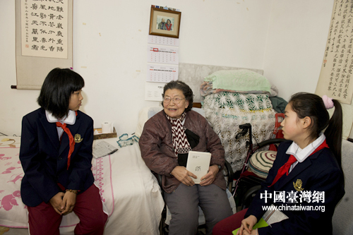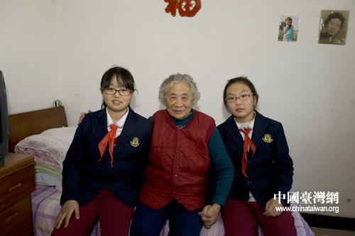 梁淑琴老人的女兒在國外定居,她說看到了孩子們就想起了自己的外孫女,要和兩個“外孫女”合個影。 (中國臺灣網發 尹珺攝)