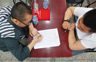 招聘會上,服刑人員手里拿著招聘資料,考慮自己的就業(yè)方向。