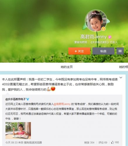 “點(diǎn)讀機(jī)”女孩的本尊高君雨今天下午通過個(gè)人微博回應(yīng)稱,網(wǎng)上有關(guān)考試失利的消息都是假的,自己目前仍是一名初二的學(xué)生,沒有參加中考、更沒有參加高考,請(qǐng)大家不要聽信謠言。