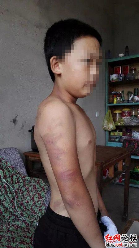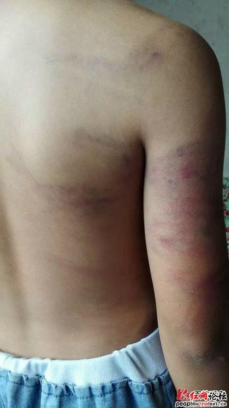 2015年6月12日晚,上小學五年級的小豪(化名)很晚才回家。回家后沒吃晚飯就睡下了。第二天早上,叫孩子吃早飯的奶奶和姑姑發現11歲的小豪“全身多處淤青,簡直就是遍體鱗傷”。在姑姑的追問下,小豪說出了自己身上的傷是被四年級的譚老師打的。在紅網論壇的圖片中,孩子全身多處淤青紅腫,有的地方還被打破了皮。