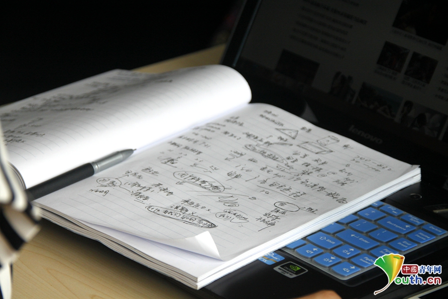 韓曉龍的筆記本上面記錄了很多關(guān)于新項(xiàng)目的點(diǎn)子和細(xì)節(jié)。中國青年網(wǎng)記者 郭文靜 攝