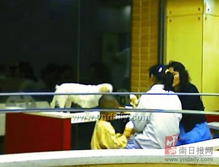 前晚8點左右,市民張先生和女友到火車站旁的一家快餐店吃晚餐。剛坐下不久,就見兩位女士帶著孩子進店用餐,沒想到接下來的一幕讓張先生等人瞠目結舌:3人一邊吃冰激凌,一邊把狗抱上了餐桌分享美食。當店里的保安制止這一行為后,兩位女士似乎沒怎么當回事,轉而把狗抱在懷里繼續用餐。