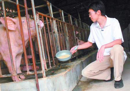 去年中旬的一天,第一批種豬終于生產(chǎn)了。當(dāng)時(shí)有一頭母豬難產(chǎn)。 “如果小豬產(chǎn)不出,就會(huì)在母豬肚子里腐壞。這樣一來(lái),母豬就會(huì)喪失生產(chǎn)能力。”樊磊說(shuō),當(dāng)時(shí)他急得頭上直冒汗,唯一可行的方法就是人工助產(chǎn)。情急之下,樊磊果斷地把右手伸進(jìn)了母豬的產(chǎn)道,終于將小豬拉了出來(lái)。