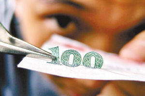目前,造假幣技術不能使“100”標志具變色功能。變造假幣者非法購進假幣后,用刀片、銼刀和錘子等工具,把百元真鈔的“100”標志移到假幣上,同時把假幣上的“100”標志移到真鈔上。此后,又想法讓毛澤東像等圖案具有凹凸感。至此,對假幣的變造結束。