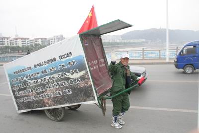 北京申奧成功后,他開始了宣傳奧運之旅。“我拉著200公斤重的‘房子’走了1.5萬多公里,板車就是我宣傳奧運的工具!”陳游說,兩年時間他已經走了全國17個省市。