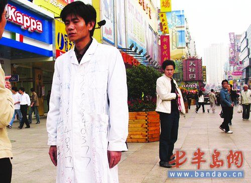 “我出租自己的身體,商家可以在我的衣服上寫(xiě)上宣傳的內(nèi)容,或讓我穿他們制作的衣服,我給商家做‘活’廣告牌。”該男子告訴記者,他叫薛曉儒,今年 25歲,是山東日照人。薛曉儒稱(chēng),3年前他來(lái)到青島,一直在城陽(yáng)打工。他有個(gè)妹妹,一年前到青島開(kāi)發(fā)區(qū)打工,后來(lái)妹妹與他突然失去了聯(lián)系。之后,他便四處尋找妹妹的下落,工作也被迫辭掉了。