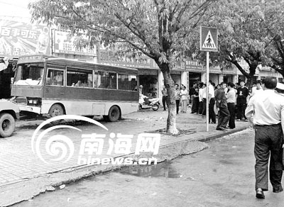 10月31日中午12時(shí)10分左右,海口公交8路中巴車,行駛到白龍南路海口第4中學(xué)公交車站時(shí),突然沖向在公交站臺(tái)等車的人群,將正在等車的3名學(xué)生撞倒,失控中巴拖著兩名學(xué)生沖過(guò)綠化帶和非機(jī)動(dòng)車道,撞墻后才停在了人行道上,事故造成3名學(xué)生1死兩傷。