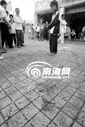 12時(shí)40分,記者趕到現(xiàn)場(chǎng),看見(jiàn)車站候車亭北側(cè)的綠化帶內(nèi)一片狼藉,綠化帶外非機(jī)動(dòng)車道路上散落著3只帶血跡的拖鞋。現(xiàn)場(chǎng)已經(jīng)拉起警戒線,警戒線內(nèi)一輛車牌號(hào)為瓊A44300的中巴車歪著停在人行道上,其前擋風(fēng)玻璃、前保險(xiǎn)桿等部件已經(jīng)損壞,地上散落了一地的玻璃碎片。中巴車旁邊的人行道上,有兩灘血跡,現(xiàn)場(chǎng)交警說(shuō),是兩名傷者留下的血跡。