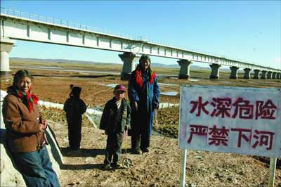 7月,雨季,沱沱河干枯的河床上一條黃毛狗在奔跑,不見寬廣河面,不見奔騰的河水,大地被烈日灼烤,裸露的河灘將水流分成幾股向東遠去。全長1389.6米的長江源特大橋橫跨河上,橋北是江澤民題詞的“長江源環保紀念碑”,橋南一塊警示牌字跡清晰,上面寫著:“水深危險,嚴禁下河。”