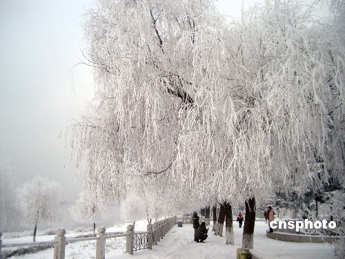 十一月二十一日早,吉林市出現了今冬首場霧凇奇觀。松花江上薄霧環繞,江邊垂柳被冰晶緊緊纏住,長堤旁、街路邊,一片銀裝素裹。 中新社發 蒼雁 攝