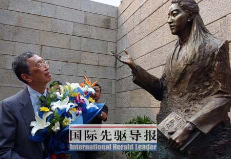 2005年9月9日,張紹進向位于南京大屠殺遇難同胞紀念館祭奠廣場的張純如銅像獻花。