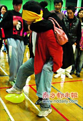 這位健壯的男士被蒙上眼睛,身上背著一位纖弱文靜的女士快速往終點沖去,途中,他輕松地越過一張椅子、接著踩爆路上一個氣球,最后到終點把地上的一朵玫瑰撿起來并送給拍檔,20米的距離不超過2分鐘就完成了!拔覀兘裉斓谝淮我娒,第一次合作,第一次就拿了第一!”背著搭檔劉小姐,小梁興奮地對記者說,他們前一天晚上才在網上認識對方,聊著覺得感覺不錯就過來參加活動。“想不到我們默契那么好!對以后的發展蠻有信心的。”劉小姐紅著臉,喜悅之情溢于言表。