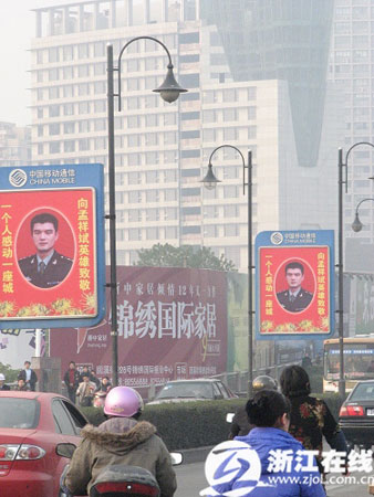 “聽說,廣告公司老板虧了六十萬,就想把英雄好好宣傳!庇浾邉偟浇鹑A時,曾經也是軍人的的哥葉錦良帶記者經過城南橋,指著顯示屏,特地告訴記者這個細節。之后浙江在線記者再次向王超忠印證時,他揮揮手,閉口不談。