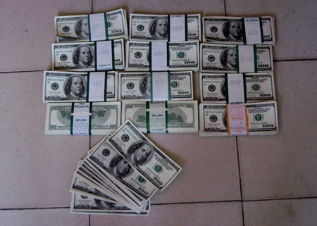 2007年12月29日10時許,偵查員又將交易地點定在昆明市翠湖南路某賓館。當日10時30分許,方某帶著假美元終于出現。在拿到錢后,毫無防備的方某正準備走出房門時,被埋伏在周圍的6名偵查員當場摁住。經過清點,現場查獲面額100元的假美元共計1246張,按市值估量,相當于人民幣91萬多元。