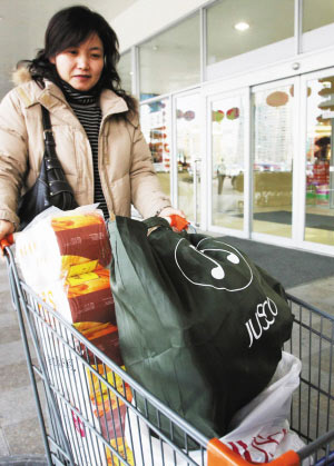 據佳世客所屬的公司青島永旺東泰商業(yè)有限公司營業(yè)企劃部李課長介紹,公司2007年11月8日推出“購物袋自帶運動”,首批印制了3萬個尼龍綢布環(huán)保購物袋,在東部購物中心及黃島購物中心同時推出,免費發(fā)放給積分卡會員,非會員如需購買,每個布袋按成本價12元銷售。據統(tǒng)計,截至去年年底,共發(fā)放了2萬多個,平均每天發(fā)放300多個。而從統(tǒng)計數字也可看出,這些環(huán)保購物袋的使用頻率非常高,自發(fā)放日起至當月月底,共有2700人次使用,而截至12月底,共5000余人次使用。