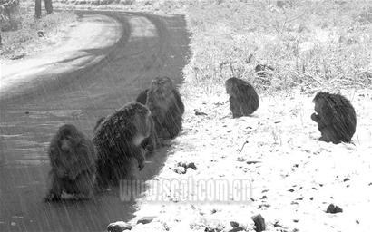18日下午4時,龍池大雪覆蓋的盤山道上,孫大爺略帶佝僂的背影漸漸遠去。身后,目光堅毅的猴王帶著妻妾和臣民,向它們的晚餐地——存放玉米的猴王坪小木屋進發。幾棵銀裝素裹的雪松下,一雙長滿老繭的手在空中劃出一道道金黃的弧線,成千上萬顆玉米掉落在一只只期盼的眼睛前。平時嘰嘰喳喳吵吵鬧鬧的猴群此時一片寂靜,群猴都在暗中發力,盡可能多地把食物搶進嘴中,僅僅十來分鐘,地上的玉米便被一搶而空。“猴子總是比人更容易滿足!”孫大爺愛憐地看著他的“山娃”們。“酒足飯飽”后,猴王開始“嗷嗷”叫著和孫大爺告別,招呼著隊伍向住處——位于半山腰的水簾洞而去,莽莽雪原瞬間把剛才還喧鬧的精靈們還原成蒼茫天地間的一個個小黑點。