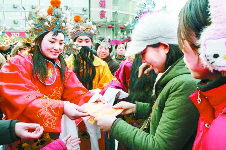 “財神”、“年神”、“春神”現身鄭州二七廣場,把1000張“春天帖”發給市民,邀請大家春節逛廟會。