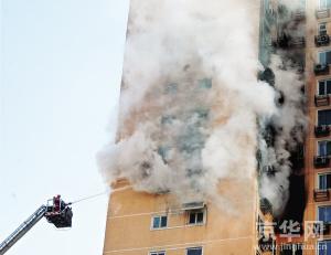 昨天上午8點,記者看到,事發小區門口已拉上警戒線。大量消防車、警車及120急救車停在門口。12號樓14層西側的幾個窗口處還在不斷向外冒著濃煙,并有玻璃碎片從樓上掉落。消防員站在高架云梯上用水槍撲滅余火。