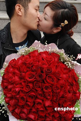 資料圖:二月十四日,深圳歡樂谷舉辦“甜蜜玫瑰之吻”特別活動,一對對情侶在玫瑰花相伴下激情相擁熱吻,表達心中的愛意,共度浪漫情人節。 中新社發 陳文 攝