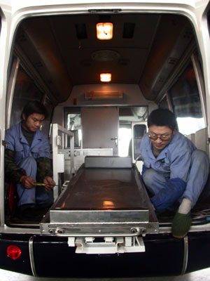 執行區內與洗手池相鄰,依次排著4個折疊彈簧坐椅。執行區的中央擺著一張高0.8米、長1.8米的執行床,床面是一層高強度鋁合金。“車體后部以前是封閉的,現在改裝成了兩扇門。”兩位工人站在執行床兩側演示:把執行床往車后一推,床下的支架立即折疊起來,執行床沿著滑道伸出了后車門。離地面0.3米高時,一位工人從床下抽出了一根支架撐起,“被執行人躺在上面后,就順著滑道再推回車內。”